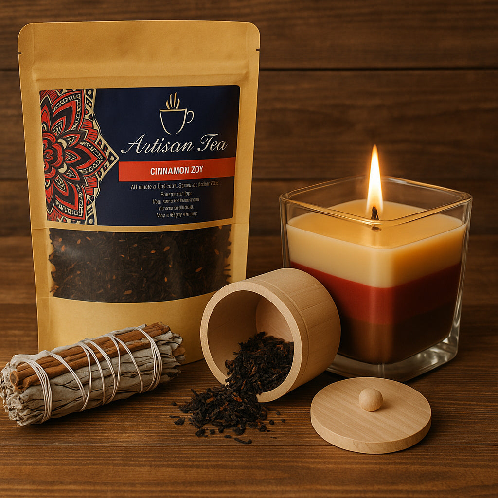 Un écrin de chaleur et de purification. La cannelle, épice du feu sacré, s’invite dans trois formes complémentaires : la flamme douce de la bougie, la fumée purificatrice de la sauge et la saveur réconfortante du thé noir.